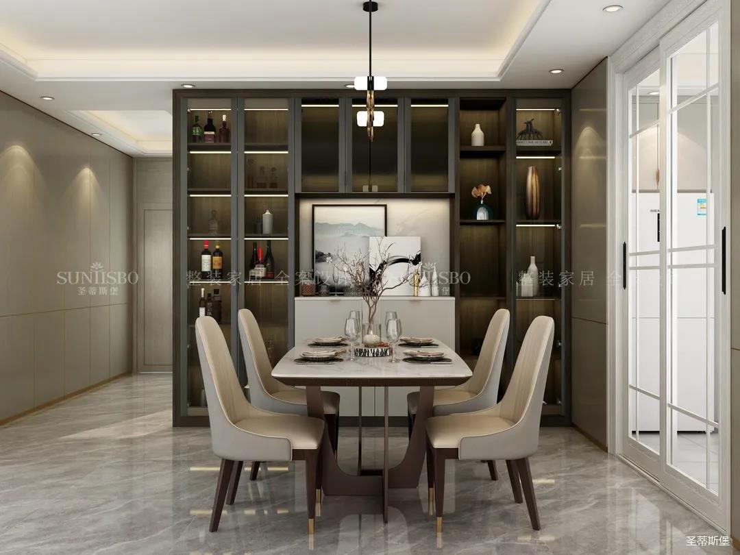 餐厅全开放式的布局,遵循了家具收纳的28原则,20%的封闭式储纳,收纳不常用的杂乱物品,80%的半开放设计,展示软装饰物。餐边柜将玻璃、金属、实木材质糅合分配,让空间质感倍增的同时,也让用餐空间多了一份家的温度。